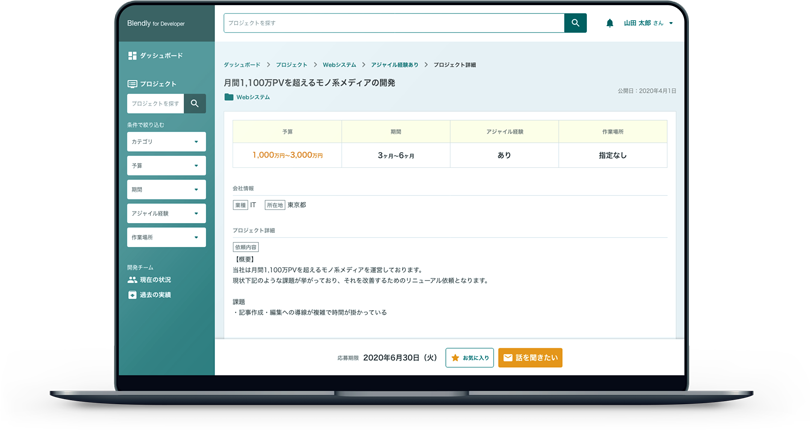Blendlyに登録いただけるのは当社の基準をクリアした、アジャイル開発に理解があるパートナーのみ。「短期間・低予算でMVPを作りたい」「プロダクトオーナーを探している」といったアジャイル関連の仕事に絞って探すことができます。